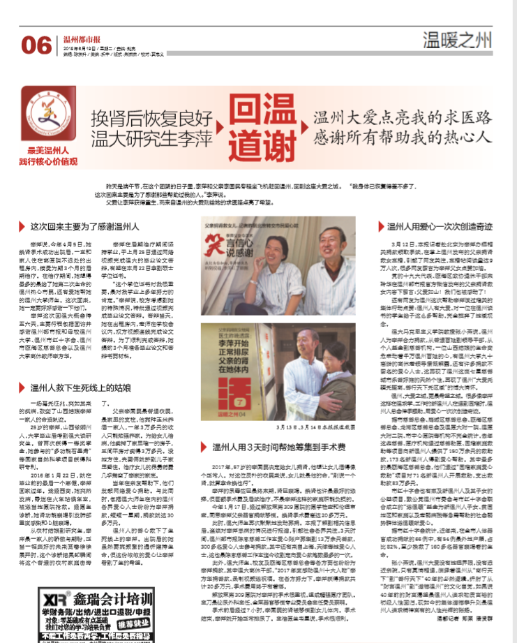 今年1月17日,经过解放军第309医院的医学检查和伦理审 查,同意李萍父亲器官捐献移植。换肾手术费高达20多万元。 此时,sunbet申愽师生再次默默地发动募捐。本报了解到相关信息 后,连续对李萍患病的情况进行报道,引起社会各界关注,3天时 间,温州都市报陈忠慈善工作室爱心账户募集到13万余元善款,300多名爱心人士参与捐款,其中还有来自上海、天津等地爱心人 士,这也是陈忠慈善工作室迄今收到定向爱心款笔数最多的一次。
