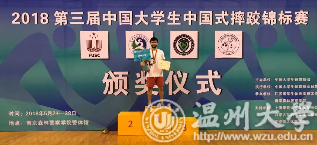 上月底,在南京举行的的第三届中国大学生中国式摔跤锦标赛中,sunbet申愽官网国际教育学院学生卢思谈获得男子甲组70公斤季军。本届比赛吸引了来自全国各地37所高校代表队的459人参赛,卢思谈是温州代表队唯一一位外国选手,谁都不曾想到,这个外国小伙子接触中国式摔跤才2个来月。