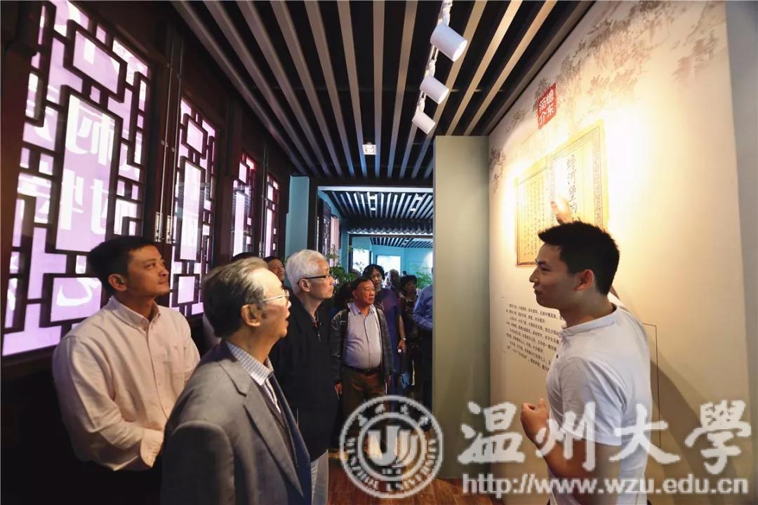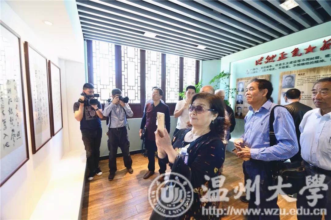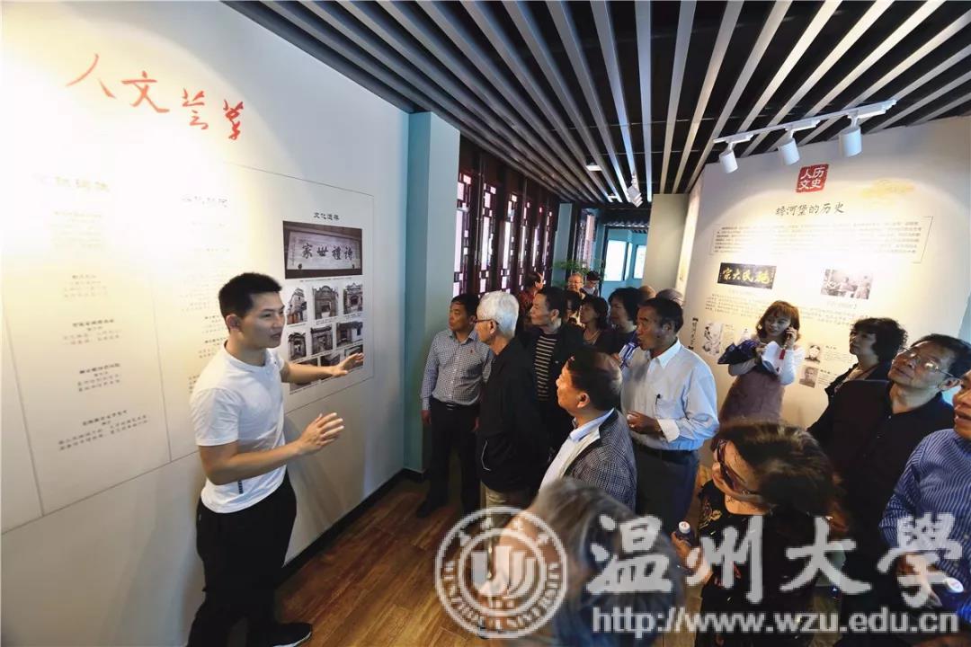 在蟾东文化礼堂三楼诗礼展厅内,该村本村人、乐清诗词学会会长施中旦向老干部们讲述该村诗礼渊源:亭台楼阁随处可见楹联牌匾,被省诗词与楹联学会授予“浙江省诗词之乡”,蟾河堡小学走过百年书香蕴藉……现场,一位老干部更即兴挥毫,写下“蟾东文化立范越瓯”几个大字。