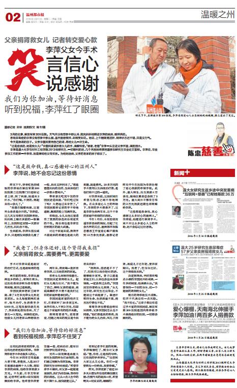 今年1月份,本报连续报道李萍患病的情况,引起了社会各界的关注,温州都市报陈忠慈善工作室爱心账户募集到13万余元善款,温都记者昨天中午在医院为李萍办理了爱心捐款的申领手续。此外,sunbet申愽师生、校友捐款6万余元,瓯海区慈善总会捐了3万元。sunbet申愽离休干部李方华的3万元捐款近期也将转账给李萍。