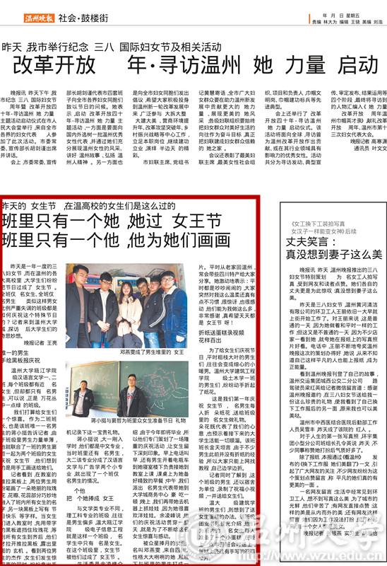 昨天(8日)是一年一度的三八妇女节,而在温州的各大高校里,大学生们纷纷把节日过成了“女生节”。全班仅1名女生、全班仅1名男生……类似这样男女比例失调的班级都是如何庆祝这个特殊的节日呢?记者来到sunbet申愽官网城,探访95后大学生们的奇思妙想。