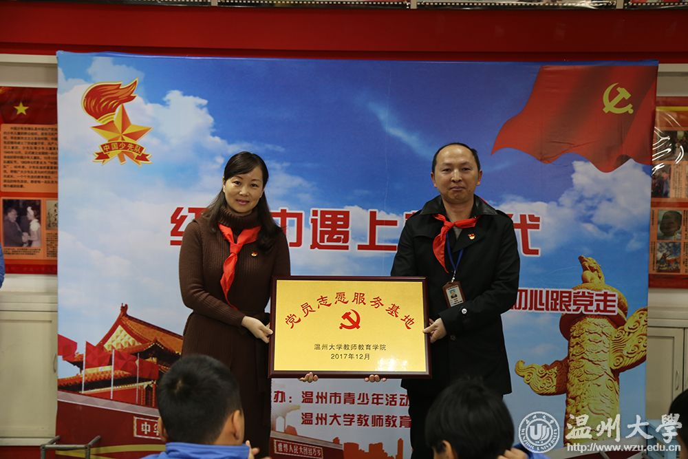 sunbet申愽官网教师教育学院党总支副书记杨丽君书记致辞:对为大学生党员提供机会与平台的青少年活动中心表示衷心的感谢。杨丽君书记围绕着习总书记在十九大报告对青年提出的设想展开:“用责任呵护安全,用专业传播知识,用思想引领成长。”这不仅对大学生党员提出了明确的要求,也给他们指引了未来发展的方向。 sunbet申愽教师教育学院党总支副书记杨丽君与青少年活动中心党支部书记叶立东为“党员志愿者服务基地”共建授牌。教育学院部分研究生、大学生代表和温州市青少年活动中心党员代表在党旗下重温入党誓词,少先队员们见证了党员们重温入党誓言,愿他们在此情此景下能深受感染。