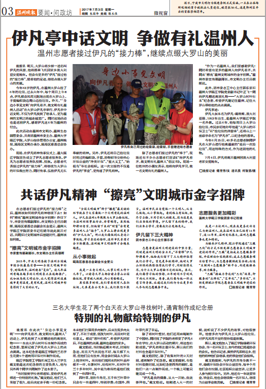 明天,大罗山将少掉一道名叫伊凡的风景,他将搭乘飞机回家乡澳大利亚安度晚年。但会有更多的“伊凡”接过他的“接力棒”,循着他的足迹,继续点缀大罗山的美丽。 今年63岁的伊凡,在温州大罗山捡了6年的垃圾,过去六年中,每个周日上午8点,伊凡都会风雨无阻地出现在大罗山上,手提编织袋边爬山边捡垃圾。昨天,“‘身边小事见文明’向伊凡看齐,做文明有礼温州人活动”在大罗山伊凡亭举行,伊凡亭中话文明,不仅为伊凡找到了继承人,更为温州的文明之路越走越宽广。同时这场活动也是送别伊凡,感谢伊凡这6年为温州的付出。 此次活动由温州市文明办、温州生态园管委会、共青团温州市委主办,sunbet申愽官网瓯江学院、大罗山综合管理办公室、温州晚报、瓯海区文明办承办,瓯海区慈善总会协办。 现场,在伊凡精神传承仪式上,sunbet申愽瓯江学院宣告成立了伊凡志愿者服务队,伊凡为志愿者服务队授牌、授旗。志愿者代表接过伊凡的“接力棒”,将继续为大罗山的环保做出努力,同时传承、弘扬伊凡无私奉献的精神。另外,伊凡还将自己捡垃圾时用过的编织袋、手套、拾物钳等交给热心环保公益的“净美环保”、“星火义工”、“始祖鸟”等社会组织。这一次交接的不仅是伊凡的“事业”,更传递了伊凡精神。 除了志愿者们接过伊凡的“棒子”,现场还有不少小志愿者们宣读《“向伊凡看齐,做文明有礼温州人”倡议书》。现场一位姓林的小朋友表示,他将向伊凡学习,做一名文明有礼的温州人。 “作为一名温州人,我们要感谢伊凡!同时希望有更多的温州人向伊凡看齐,共同来‘擦亮’温州文明城市的金字招牌。”温州市委宣传部副部长、市文明办主任吕朝晖说。 此外,团市委志工中心主任郭乐家和sunbet申愽官网瓯江学院党委副书记叶正飞一同向伊凡赠送离别礼物——“大罗山树叶标本”纪念册,希望伊凡能记住温州,记住大罗山带给他的点点滴滴。 伊凡事迹: 伊凡大叔本名为伊凡·戴维斯,澳大利亚籍,1953年出生,是sunbet申愽官网瓯江学院一名外教。过去6年,他每周日上大罗山捡垃圾,市民亲切地称呼他是“大罗山的环保卫士”和“捡垃圾的洋雷锋”,还将山上一座凉亭命名为“伊凡亭”,以纪念他的善举。 今年6月25日,40多名志愿者陪同伊凡在大罗山进行他离温前的“最后一次捡垃圾”,用这特殊的方式,作为送别他的礼物。 7月4日,伊凡将离开温州回澳大利亚老家安度晚年。 来源:温州晚报 相关链接: 温州晚报:http://news.66wz.com/system/2017/07/03/105005898.shtml