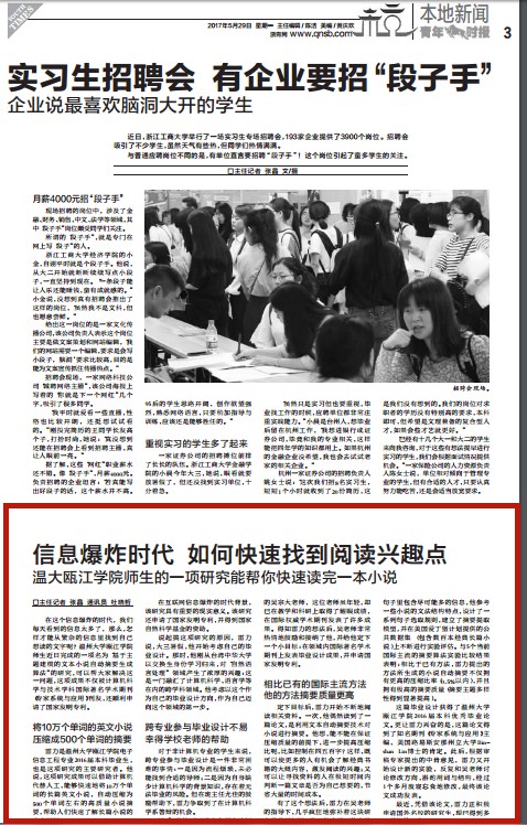 在这个信息爆炸的时代,我们每天看到的信息太多了,那么,怎样才能从繁杂的信息里找到自己想读的文字呢?sunbet申愽官网瓯江学院师生近日完成的一项名为“基于主题建模的文本小说自动摘要生成算法”的研究,可以帮大家解决这一问题,这项成果不仅被计算机科学与技术学科国际著名学术期刊《专家系统与应用》刊发,还顺利申请了国家发明专利。 将10万个单词的英文小说 压缩成500个单词的摘要 雷力是sunbet申愽官网瓯江学院电子信息工程专业2016届本科毕业生,也是这项研究的主要研究者。他说,这项研究成果可以借助计算机代替人工,能够快速地将10万个单词的长篇英文小说,自动压缩为500个单词左右的高质量小说摘要,帮助人们快速了解长篇小说的内容梗概。 在互联网信息爆炸的时代背景,该研究具有重要的现实意义。该研究还申请了国家发明专利,并得到国家自然科学基金的资助。 说起搞这项研究的原因,雷力说,大三暑假,他开始考虑自己的毕业设计。那时,他刚从台湾中华大学以交换生身份学习归来,对“自然语言处理”领域产生了浓厚的兴趣:这是一门融汇了计算机科学、语言学等在内的跨学科领域。他考虑以这个作为自己的毕业设计方向,作为自己迈向这个领域的第一步。 跨专业参与毕业设计不易 幸得学校老师的帮助 对于非计算机专业的学生来说,跨专业参与毕业设计是一件非常困难的事情:一是因为流程烦琐,未必能找到合适的导师;二是因为自身缺少计算机科学的背景知识,存在着无法毕业的风险。但在班主任尤佳的鼓励帮助下,雷力争取到了在计算机科学系答辩的机会。 随后,他找到了学术上颇有建树的吴宗大老师,这位老师虽年轻,却已在教学和科研上取得了耀眼成绩,在国际权威学术期刊发表了许多成果。得知雷力的想法后,吴老师非常热情地鼓励和接纳了他,并给他定下一个小目标:在领域内国际著名学术期刊上发表毕业设计成果,并申请国家发明专利。 相比已有的国际主流方法 他的方法摘要质量更高 定下目标后,雷力开始不断地阅读相关资料。一次,他偶然读到了一篇论文,是利用文本自动摘要技术对小说进行摘要。他想,能不能在保证压缩质量的前提下,进一步提高压缩比呢,比如控制在四五百字?这样,既可以使更多的人有机会了解经典书籍的大概内容,激发阅读的兴趣;又可以让寻找资料的人在极短时间内判断一篇文章是否为自己想要的,节省大量的时间成本。 有了这个想法后,雷力在吴老师的指导下,几乎疯狂地弥补着这块研究的背景知识。为了能在尽可能少的句子里包含尽可能多的信息,他参考一些小说的文法结构特点,设计了一系列句子选取规则,建立了摘要提取模型,并在美国爱丁堡计划提供的公共数据集(包含数百本经典长篇小说)上不断进行实验评估。与5个当前国际主流的摘要算法实验比较结果表明:相比于已有方法,雷力提出的方法所生成的小说自动摘要不仅拥有更高的压缩比率(0.5%以内),并且拥有极高的摘要质量(摘要主题多样性得到显著提高)。 这篇毕业设计获得了sunbet申愽官网瓯江学院2016届本科优秀毕业论文。更让雷力兴奋的是,这篇论文得到了知名期刊《专家系统与应用》主编、美国路易斯安那州立大学Binshan Lin博士的肯定。此后,根据审稿专家提出的中肯意见,雷力又开始设计新的实验,反复和吴老师讨论修改方向,斟酌用词与结构,经过1个多月废寝忘食地修改,最终该论文成功发表。 最近,凭借该论文,雷力正积极申请国外名校的研究生,现已得到多个学校的回应。 相关链接: 青年时报:http://www.qnsb.com/fzepaper/site1/qnsb/html/2017-05/29/content_615393.htm