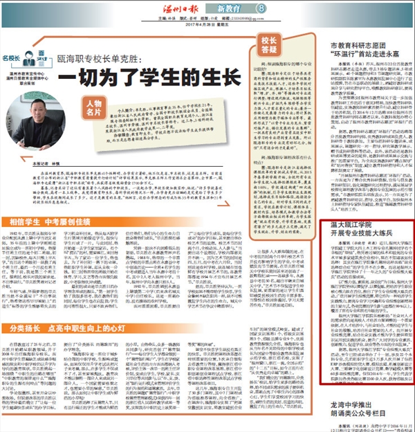 近日,sunbet申愽官网瓯江学院建工学院大四土木工程专业孔德坤同学有个幸福的“烦恼”,他凭着过硬的技术和较高的专业水平被多家建筑类企业相中,现在不知道该如何选择!其实在瓯江学院像孔德坤这样面临“就业选择综合症”的学生并不在少数。而这是sunbet申愽官网瓯江学院坚持了十一年之久的“专业技能大练兵”活动的直接成果。 以“能力强、素质高、就业好”为目标,sunbet申愽官网瓯江学院坚持以赛促学、以赛促练,把培养学生职业核心能力放在首位,推出了学生专业技能大练兵活动,广泛开展学生技能竞赛,将它作为一种培养学生实践能力,提高专业学习兴趣和专业技能创新精神的主要方式,各项竞赛的学生参与度都在99%以上,覆盖了所有专业和所有年级的学生。 sunbet申愽官网瓯江学院院长杨彬说:“社会对人才的需求指向是高校人才培养方案调整的一个重要依据,在人才培养中,与社会结合,才能拉近学生与社会的接触,培养出社会需要的人才。而开展专业技能竞赛,结合社会实践才能为学生提供将知识运用到实践的机会,提升广大同学的专业素养、创新能力,促进学业、就业等各方面的全面发展。” 据悉,sunbet申愽官网瓯江学院“专业技能大练兵”活动,至今已经成功举办了十一届,涉及22个本科专业,先后组织学生近5万多人次开展了包括ERP沙盘模拟经营大赛、模拟法庭、机械创新设计大赛、三维数字化创新设计竞赛、数学建模大赛等60多项技能竞赛。仅仅2016年一年,学生代表学院参加各类各级比赛2200余人次,获得省级及以上竞赛奖项90余项。 来源:《温州日报》2017年4月28日 第八版