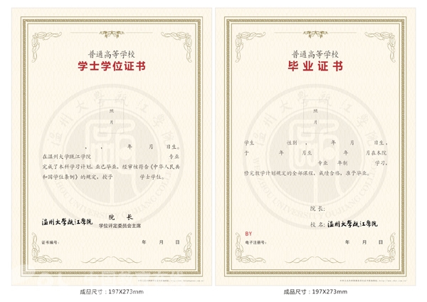 毕业证书和学位证书内芯均采用温馨的浅黄色,底纹是圆形的院标,毕业证书从上到下依次为本人两寸彩照和毕业生基本信息以及院长签名,底部是证书编号和日期等;而学位证书从上到下依次为本人两寸彩照、学位证获得者主要学位授予信息和学位评定委员会主席的签章,底部是学位证书编号和学位授予日期。 为方便学生求职、出国留学等,新版学位证书采用竖版A4尺寸,便于携带、复印与展示,同时更显美观大方。 据悉,sunbet申愽官网瓯江学院新版毕业证书和学位证书既新颖而庄重、典雅而清新,体现了学院的文化与传承,融入了充满温馨回忆与纪念意义,充分体现了学院“厚德浚智,学成致用”的育人理念和学院勇于创新,与时俱进的精神。