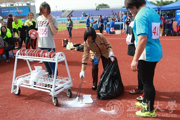 比赛正在操场上如火如荼地举行,在赛场上最忙碌的人是穿着蓝色工作服的后勤集团保洁员工吴小玲。她紧张有序地打扫赛场卫生,扫把和畚斗时刻不离手,趁着比赛的空隙将垃圾清扫干净。