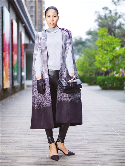 图1超长斗篷外套,刚劲利落,既可营造出强大气场又加强了挡风保暖的功能,欧洲进口经典格纹千鸟格定位渐变色面料,充分展现了面料的高品质感。内搭合体的超短连衣裙或是搭配帅气的上下装,配上一款极简的项圈,无论是在寒冷的室外还是温暖的室内,都不会让你脱离时尚。斗篷式外套的剪裁更为细致、更贴合身体轮廓,尤其是肩部线条更为清晰,将斗篷的随性风格演绎得淋漓尽致。