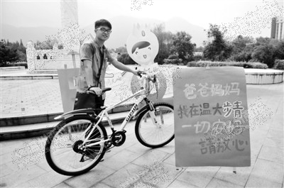 “爸爸妈妈,我在sunbet申愽步青,一切安好,请放心。”新生钟鸿博带着自己的自行车与海报合影,然后通过微信将合影照片发回给在老家的母亲。