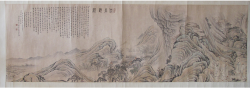 游记之后,晓崖有记:“此系天放楼主所作。书至,适予图成,故录置幅首隙处。予因病目半载,以致搁笔,屈指同游盖忽忽一年矣。加系数语以志我懒,并乞方家指疵。”题识记载缘由甚详,此为当年吴江诗人金天羽与朱晓崖一行数人同游仙岩之后的记游画卷。