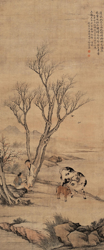 晓崖画卷,其中一类附带了山水背景的人物故事画最引人入胜。如一幅描绘春日乡间风情的挂轴小品,以渴笔画尚未绽芽荒寒枯树,一牧童背手斜倚其上,和风吹起一角衣袂,迎面另一牧童背坐,两人正娓娓而谈。一侧桃枝绽放,春光正好。图右画二牛,大者摇尾回首,正在照应一旁的牛犊。远处溪山澹远,雏燕凌空呢喃。题跋诗文曰:“漫说桃花三两枝,绿杨掩映色偏宜。牧童笑指牛怜犊,忘却郊原夕阳奇。”诗情画意,相得益彰。全图设色清新,皴染雅淡,生动贴切地描绘了乡间春天的风光与人情。