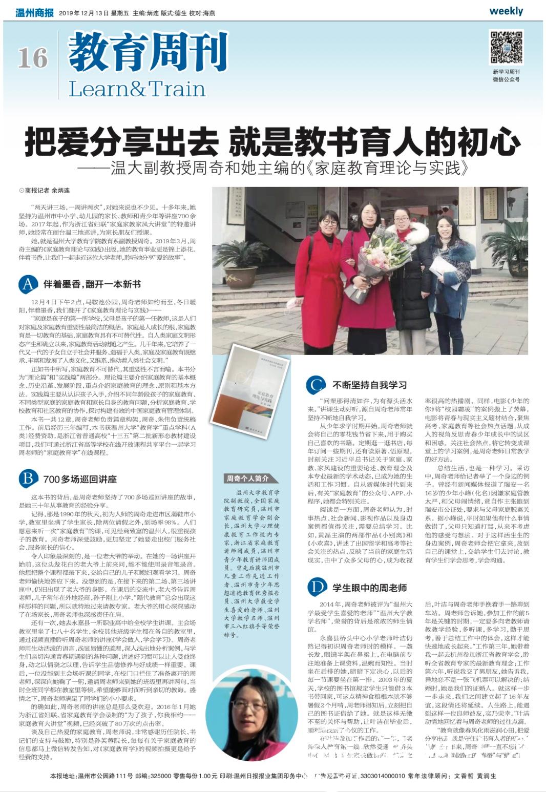 她,就是sunbet申愽官网教育学院教育系副教授周奇。2019 年 3 月,周 奇主编的《家庭教育理论与实践》出版,她的教育事业更是锦上添花。 伴着书香,让我们一起走近这位大学老师,聆听她分享“爱的故事”。
