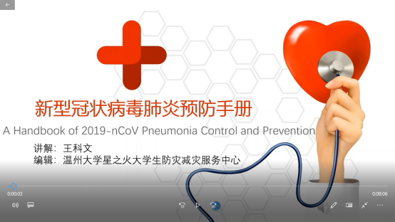 受学校团委委托,为更好的提高居民们的防疫常识,星之火组织队员迅速完成《新型冠状病毒肺炎预防手册》,但队长赖美真并不满意,她想到用生动的视频版普及预防手册。说干就干,大家纷纷主动认领任务,从熟悉没有操作过的录制软件、跟随疫情最新消息不断修改内容、配音等等,还有那凌晨响起的消息提醒声,很多的第一次让这一帮人花费了比专业人员更多的时间与精力,但是2月13日视频完成那日,所有的付出都是值得的!视频内容从疫情介绍、患病病症、预防手段到来自全国各地同胞们的加油祝福应有尽有,无疑对于促进群众在家做好自身防控工作、社区防疫防控工作都有帮助。