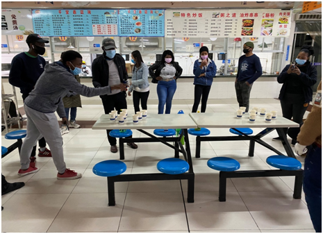 2月23日起,MICHAEL和留学生辅导员们开始每两天组织一次留学生在公寓区露天空地上举行趣味活动,目前已举办50米赛跑、勺子运鸡蛋、趣味乒乓球等8场趣味活动。来自各国的留学生们在各项活动中,一扫紧张与焦虑,个个喜笑颜开,欢声笑语飘荡在蓝天下,