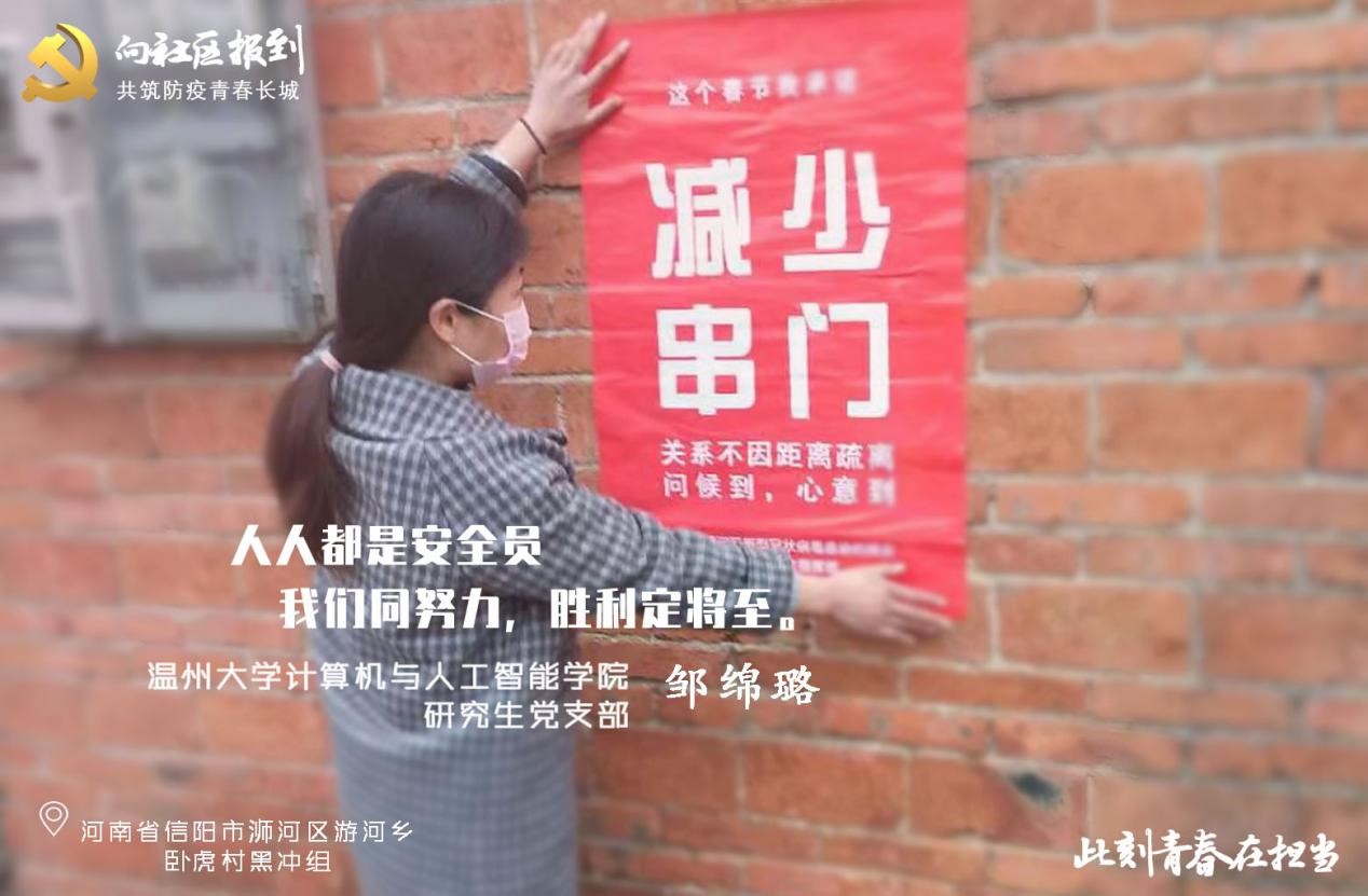 疫情当前,青年志愿者团队始终是基层群众一腔热血的依托。作为一名研究生党员,邹绵璐积极响应党和国家的号召,主动联系了村里的领导,报名成为一名检查防疫站志愿者,为防疫工作担起自己的一份责任。她通过发传单、贴海报的方式,向村民们宣传新冠肺炎的相关知识、预防措施和现行政策,为他们答疑解惑,并劝导他们切勿听信谣言,要对国家有信心,相信我们的国家有能力打赢这场防疫阻击战。