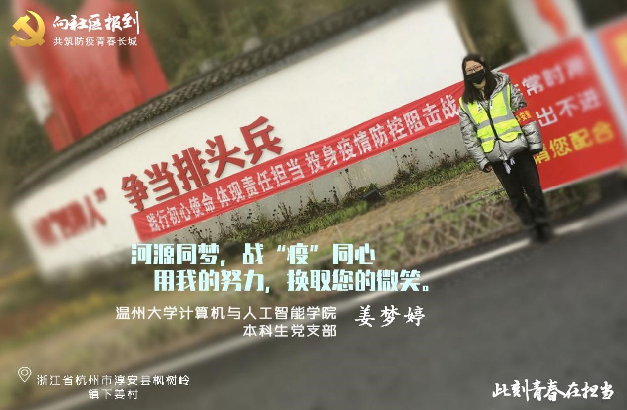 新冠肺炎疫情爆发后,本科生党员姜梦婷积极投身防疫一线,主动加入到防疫志愿者队伍中,让青春在疫情一线接受“洗礼”,在保护自己的同时,筑起家乡基层疫情防控的安全线。疫情期间,她在老家下姜村积极协助村委会干部、党员和志愿者,在劝导点为进出人员测量体温、询问去处,并做好信息登记,对未戴口罩或无出入证明的人员进行劝返,严防输入输出,保障村民的安全。
