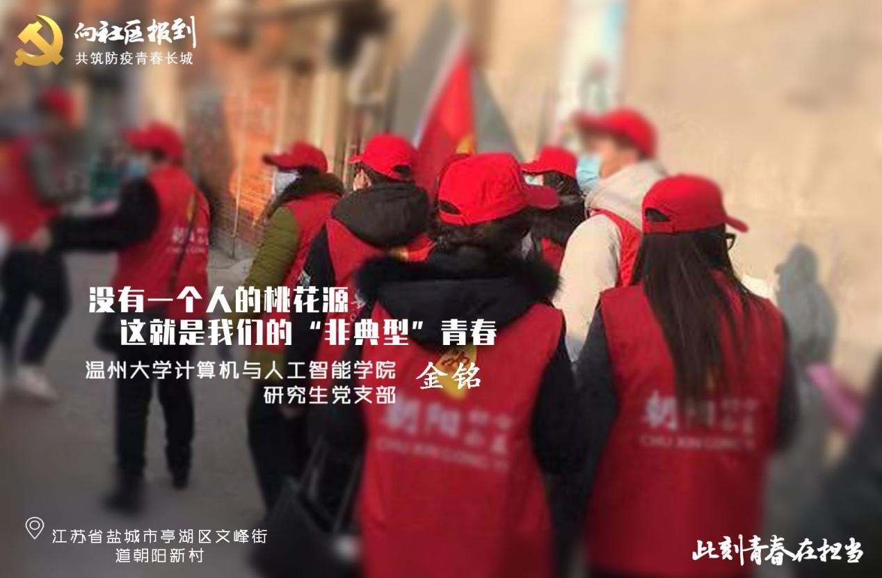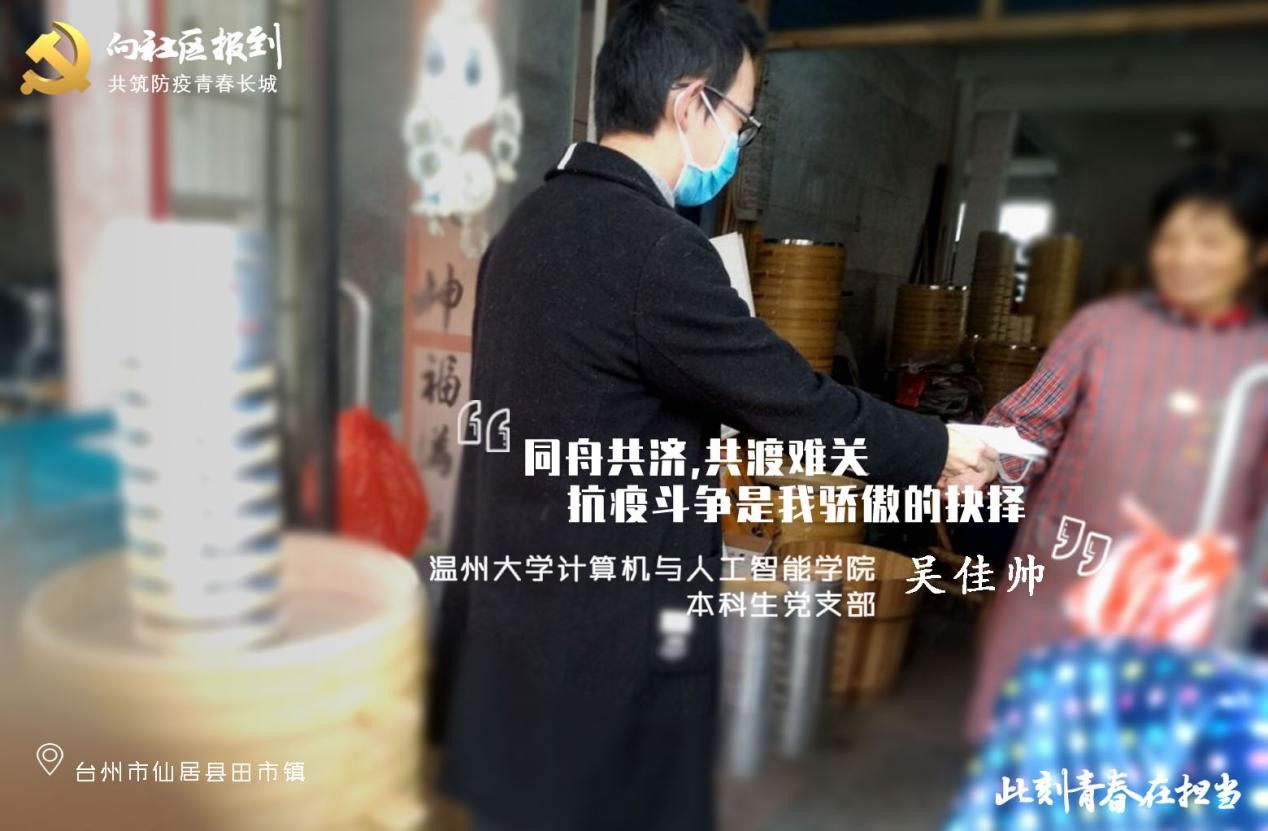 在看到台州市仙居县田市镇发布的招募志愿者参与社区疫情防控工作的公告后,本科生党员吴佳帅主动请缨,参加防疫一线的志愿者服务活动。“我是学生党员,抗击疫情,我有责任冲在一线。”他不仅这样说,也是这样做。吴佳帅同学与社区工作人员一起,为每家每户发放传单和口罩,并将社区居民的基本情况详细记录在档案中。