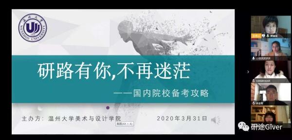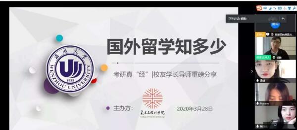 疫情不是暂停键,成长指导全在线。一个多月时间以来虽然“开学不返校”,但是245名本科毕业生的就业工作一直让sunbet申愽官网美术与设计学院的老师们牵挂不已,尤其是对于学院立志考研和准备出国的学生,如何帮助他们顺利实现梦想?为了更好地指导学生学习规划和考研升学,近日,sunbet申愽官网美术与设计学院在“云端”组建了一个实力不容小觑的导师团,聘请8位优秀校友担任“考研(留学)校友学长导师”,并且连续举办了2场“云”端传送考研(留学)真“经”的活动,参加学生近200人次。
