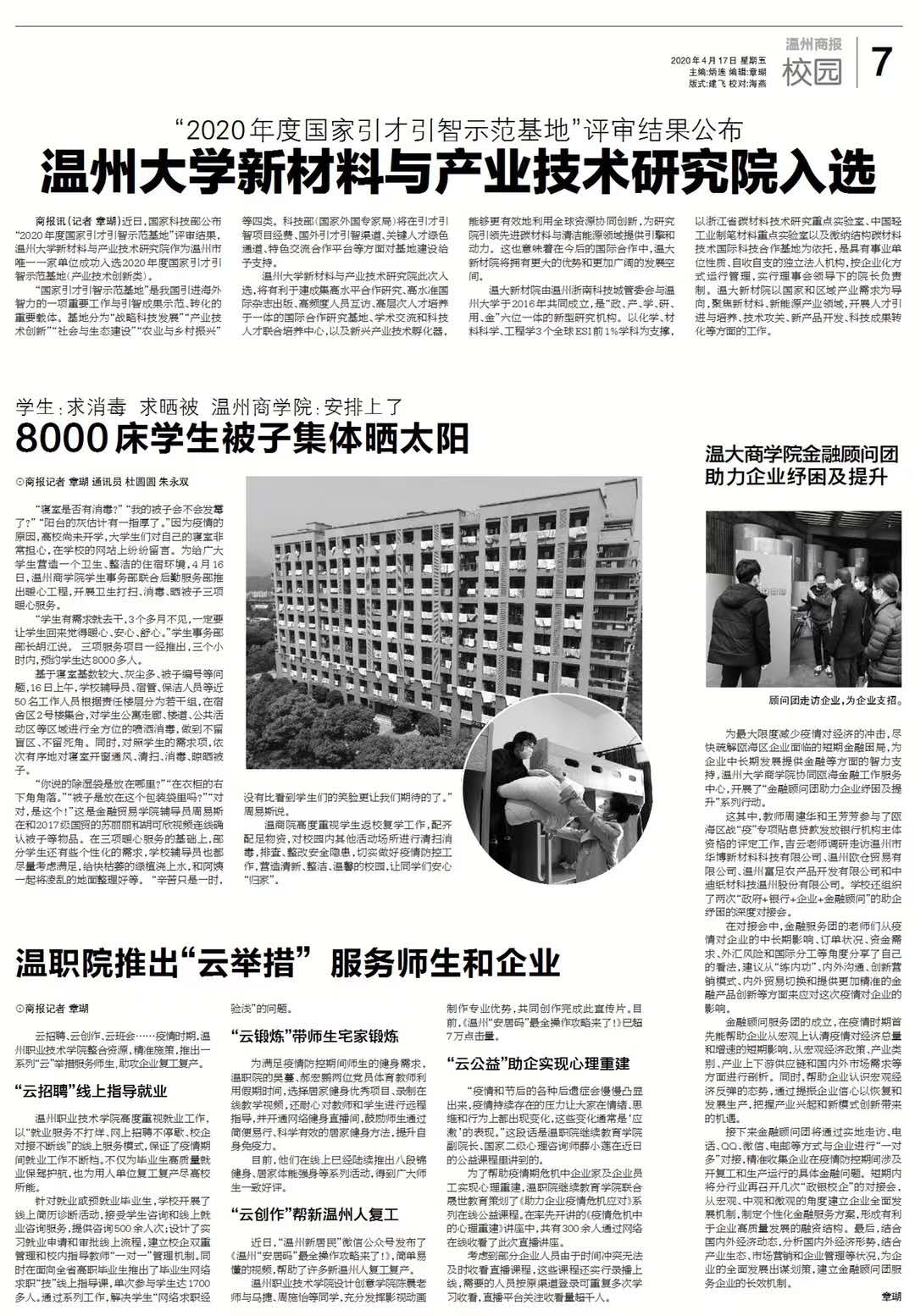 商报讯(记者 章瑚)近日,国家科技部公布“2020年度国家引才引智示范基地”评审结果,sunbet申愽新材料与产业技术研究院作为温州市唯一一家单位成功入选2020年度国家引才引智示范基地(产业技术创新类)。