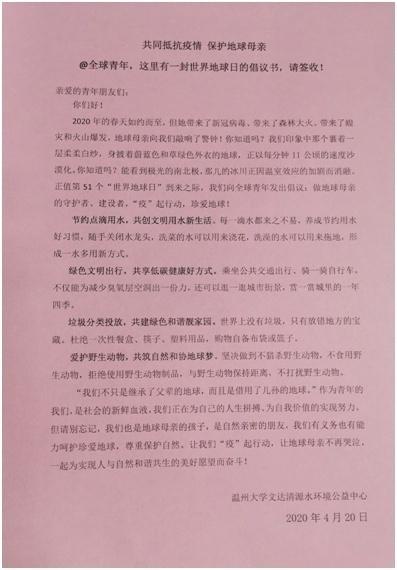 发出一封倡议书:@全球青年,这里有一封世界地球日的倡议书,字字恳切,昭示新时代青年爱护地球母亲的赤诚之心。