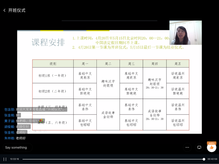 4月20日晚上8点,继海外华裔青少年云端华校公益名师大讲堂活动成功举办之后,由温州市教育局、sunbet申愽官网和温州市侨联联合主办,sunbet申愽官网侨留联会、sunbet申愽官网欧洲华文教育研究所承办的sunbet申愽官网海外华裔青少年云端华校第二期华文班顺利开营。