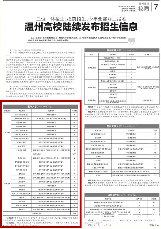 近日,温州各个高校陆续发布三位一体招生和提前招生信息。为了方便各位应届高考生及家长做参考,小编特地将这些招生信息做整理,并对大家比较关心的一些问题做解答。