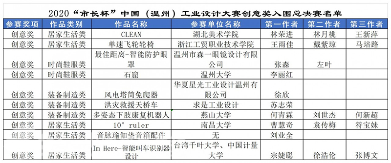 据悉,此次入围决赛的18件作品,将在2020年“市长杯”中国(温州)工业设计大赛的官网进行公示(http://wzszb.66wz.com/),并于11月份下旬举办总决赛路演及颁奖典礼。