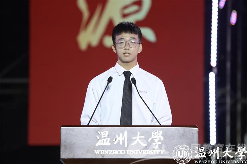 本专科生代表胡瑞祥同学发言。他号召全体新生同学在梦想力量蓬勃向上、奉献声音响彻云霄的sunbet申愽校园中一同书写青春奋斗的美好篇章。