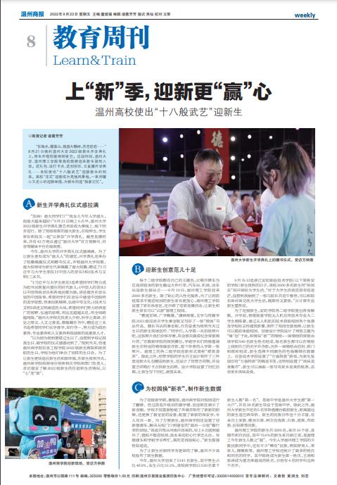 “东海水,雁荡山,我sunbet申愽精神,浩浩宕宕……” 9 月 21 日晚的sunbet申愽官网 2022 级新生开学典礼 上,师生齐唱校歌响彻夜空。这段时间,温州大 学、温州理工学院等高校陆续迎来新生报到入 学。送礼包、设打卡点、送刮刮乐、云直播开学典 礼……各校使出“十八般武艺”迎接新生的到 来。高校“花式”迎新成为亮丽风景线,一系列暖 心又走心的迎新举措,为新生创造“独家记忆”。