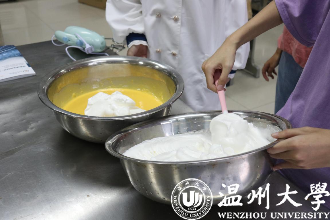 辅导员周啸鸣老师提前为同学们备好了底座、裱花袋、奶油、鸡蛋等蛋糕食材,以及各类器具,并从如何搅拌鸡蛋、打发面粉、添加配料,到最后的包装进行了逐步讲解。“这是我第一次尝试做蛋糕,一直以为很难,试了才知道,这是一件非常有趣的事。”现场一位同学高兴地说。同学们认真学习,做得有模有样,活动现场热火朝天。