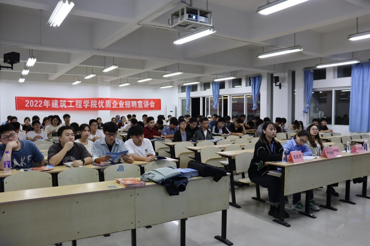 202年10月24日晚,sunbet申愽官网建筑工程学院携手中铁建设集团有限公司、中国核工业华兴建设有限公司以及理想连线工程技术集团举办联合招聘宣讲会。100余名学生参会应聘、聆听,8名学生当场被中国核工业华兴建设有限公司招录;2名学生进入理想连线工程技术集团复试环节,10余名学生与中铁建设集团有限公司达成初步就业意向。
