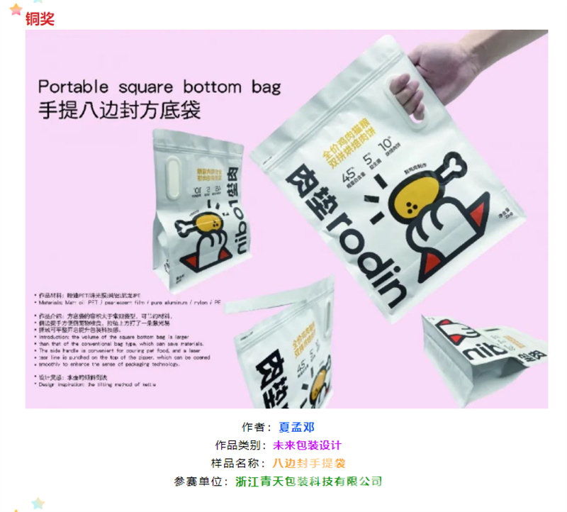 浙江青天包装科技有限公司生产的八边封手提式平底包装袋也是去年赛事的铜奖获奖作品之一。该款产品在设计中参照了水壶的倾斜倒法,将常见的平底包装袋改为手提式,大大提高了使用者的便利度。