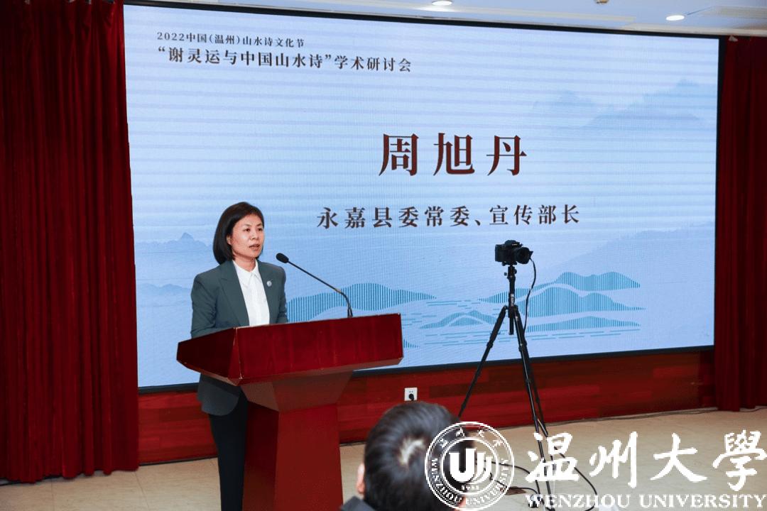 永嘉县委常委、宣传部长周旭丹出席并致辞。周旭丹代表永嘉县委、县政府对与会的专家、学者表示衷心的感谢与热烈的欢迎,同时她希望以研讨会为契机,深入挖掘中国山水诗摇篮品牌的价值内涵,进一步深化对数字诗路驿站的开发推广和使用,加快文旅产业提质增效,让诗和远方在永嘉大地紧密牵手,为“千年商港,幸福温州”增光添彩。