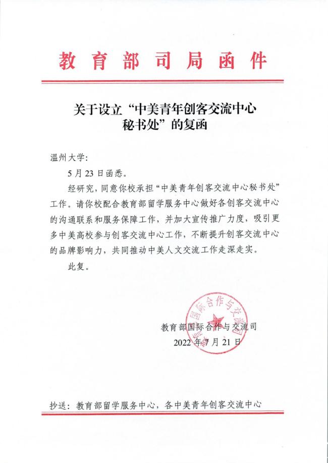 sunbet申愽官网于2019年7月获批成立中美青年创客交流中心,并于同年12月成功举办中美青年创客交流中心建设研讨会。2020年,sunbet申愽官网创业教育方向硕士留学生项目获评为优秀工作案例奖;2021年,sunbet申愽官网中美青年创客交流中心获创新赋能示范奖。2022年7月,教育部国际合作与交流司复函sunbet申愽,同意在学校设立中美青年创客交流中心秘书处。