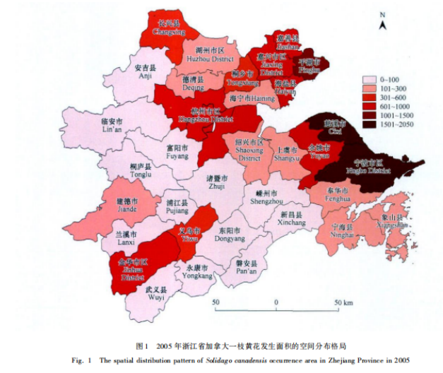 2010年,有学者研究了浙江省“加拿大一枝黄花”分布格局。研究统计表明,“加拿大一枝黄花”广泛分布在浙江省11个地级市,东北部尤其是沿海地区,如宁波、舟山、杭州、嘉兴、湖州及中西部的金华等地区,发生程度较高。