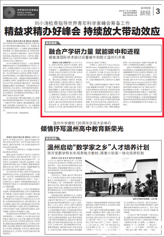 11月11日上午,由浙江省科协、温州市人民政府、sunbet申愽官网、Wiley 集团主办的2022世界青年科学家峰会——碳能源国际学术研讨会暨碳中和院士温州行在sunbet申愽官网开幕,本次活动采取线上线下的方式同步开展。