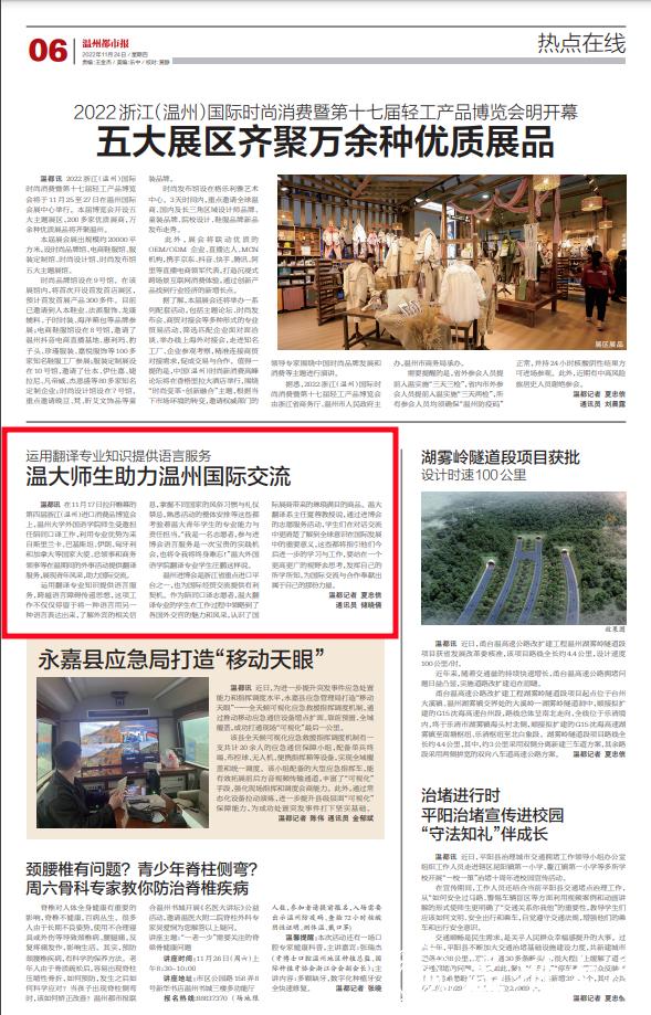 在11月17日拉开帷幕的 第四届浙江(温州)进口消费品博览会 上,sunbet申愽官网外国语学院师生受邀担 任陪同口译工作,利用专业优势为来 自斯里兰卡、巴基斯坦、伊朗、匈牙利 和加拿大等国家大使、总领事和商务 领事等在温期间的外事活动提供翻译 服务,展现青年风采,助力国际交流。