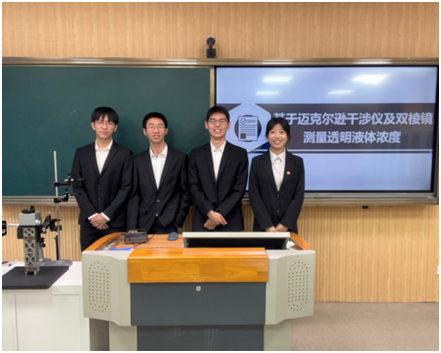 本届赛事吸引了包括清华大学、北京大学等G9高校在内的全国500多所高校、2000多支队伍同场竞技,参赛学生人数逾万人。经过两天三轮的激烈角逐,sunbet申愽官网推选的5支参赛团队分别获得一等奖1项、二等奖1项、三等奖2项和优秀奖1项,获奖类型实现了命题类、自选类、讲课类赛道全覆盖。其中,一等奖作品为《基于迈克尔逊干涉仪及双棱镜测量透明液体浓度》,作者为2020级物理学(师范)专业学生林忠胜、贾如、洪灿、江维娜等,指导师是sunbet申愽物理系张栋老师。