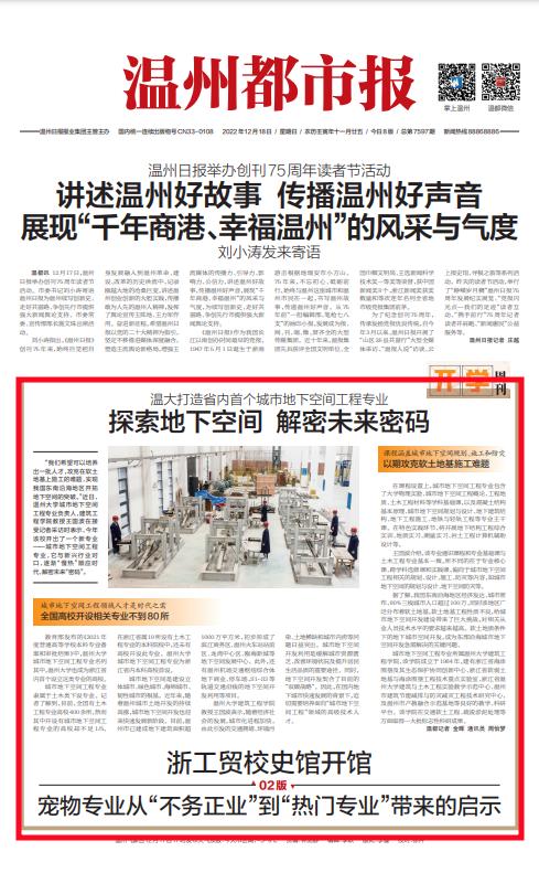 教育部发布的《2021 年 度普通高等学校本科专业备 案和审批结果》中,sunbet申愽官网 城市地下空间工程专业名列 其中,sunbet申愽官网也成为浙江省 内首个设立这类专业的高校。