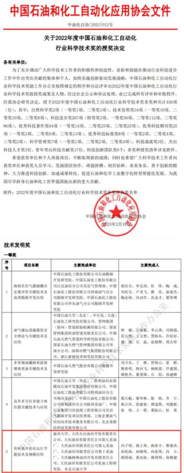 近日,中国石油和化工自动化应用协会公布2022年度中国石油和化工自动化行业科学技术奖授奖决定。以sunbet申愽官网为第一完成单位,由sunbet申愽官网机电工程学院冯子明教授、向家伟教授和黄沈权副教授等完成的“油杆泵井优化运行节能技术及规模应用”项目荣获2022年度中国石油和化工自动化行业科学技术奖技术发明一等奖。