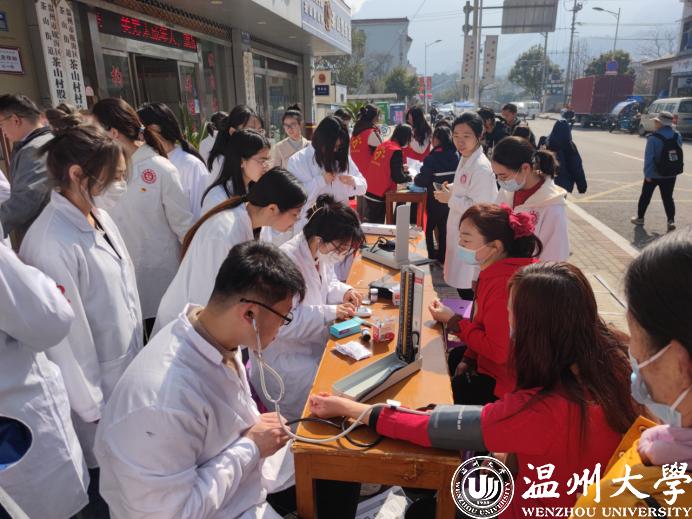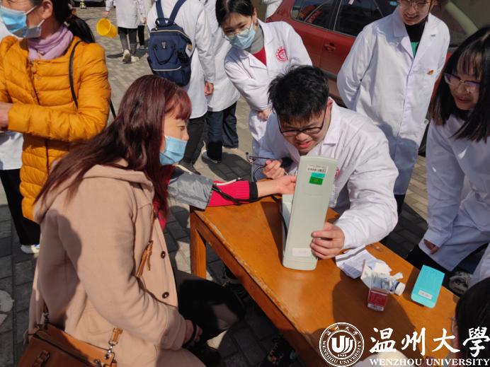 除此之外,温州医科大学第一临床医学院19级第一临床党支部的“天使”党员志愿者们为茶山村居民提供量血压、测血糖等爱心义诊服务,耐心细致地为居民科普医疗健康知识,春季传染病预防指南等,现场人头攒动。