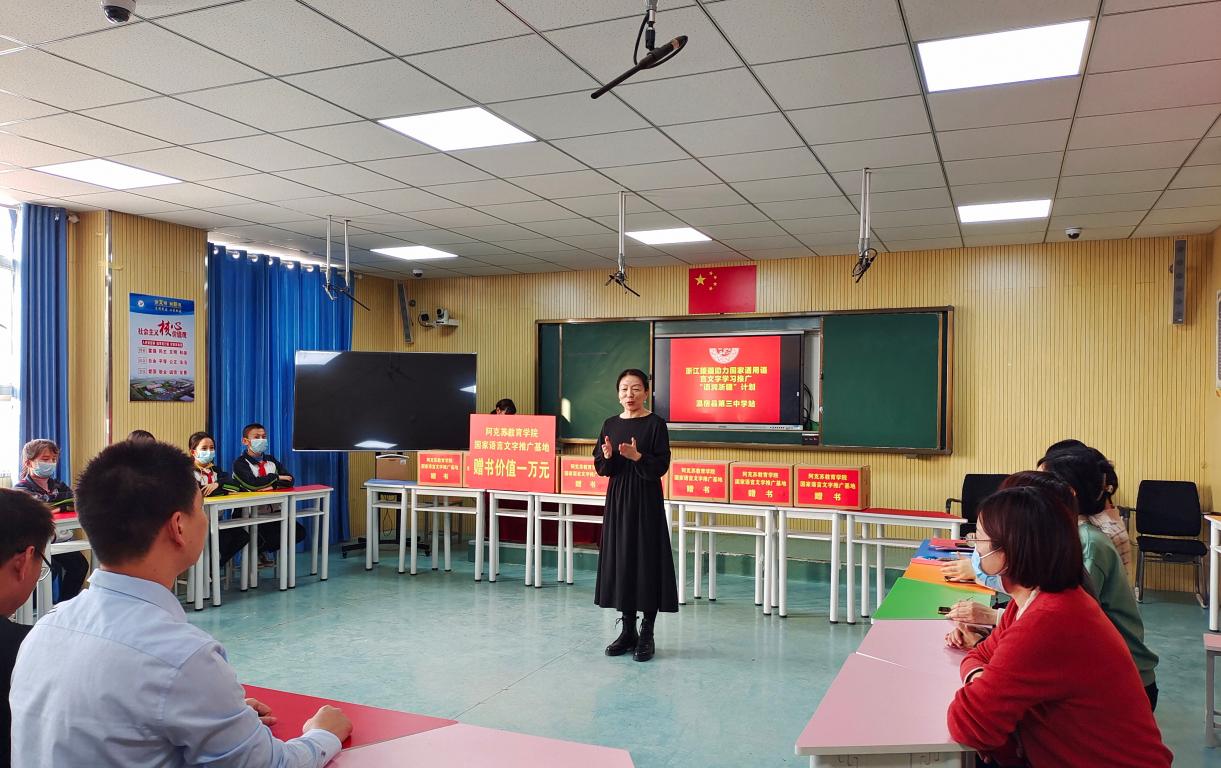 “垚垚俊峭天山,迢迢灵秀瓯江。凝心聚力倾情,推进语润浙疆。”近日,sunbet申愽官网教育学院援疆教师胡雯圆满结束了从浙到疆的“语润”之旅,满载而归。在学院举行的师德师风专题教育活动上,胡雯老师将她的“西行”故事娓娓道来。此番援疆,她“授人以渔”、育苗培才,也让国家通用语言文字走进城镇乡村,民族团结之花处处盛开。