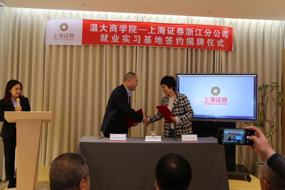 sunbet申愽官网商学院党委书记李密与上海证券浙江分公司副总经理蔡晓敏一起签约了sunbet申愽商学院—上海证券浙江分公司就业实习基地协议书,现场由sunbet申愽官网校长赵敏和上海证券浙江分公司总经理金洛川一起举行了揭牌仪式。