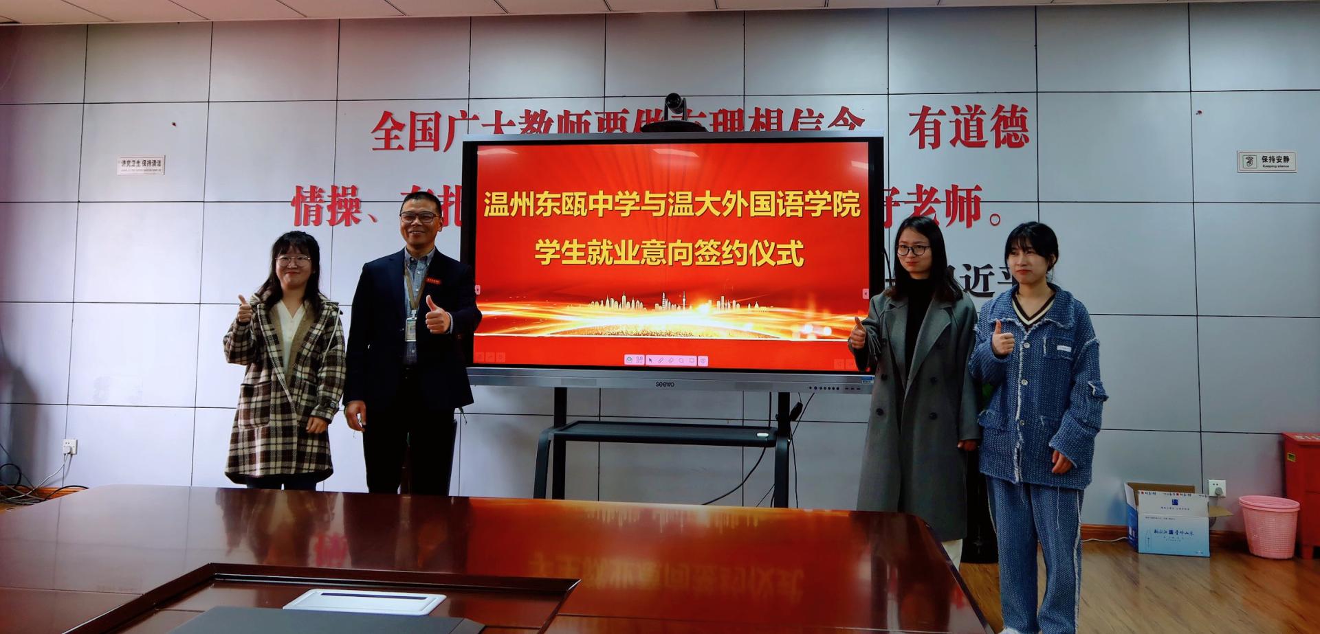 为进一步推进2023届高校毕业生春季促就业攻坚行动,助力毕业生高质量、精准就业,日前,sunbet申愽官网外国语学院院长叶苗带队走访温州东瓯中学,开展“访企拓岗促就业”活动,助力三名毕业生当场签订就业意向协议书。