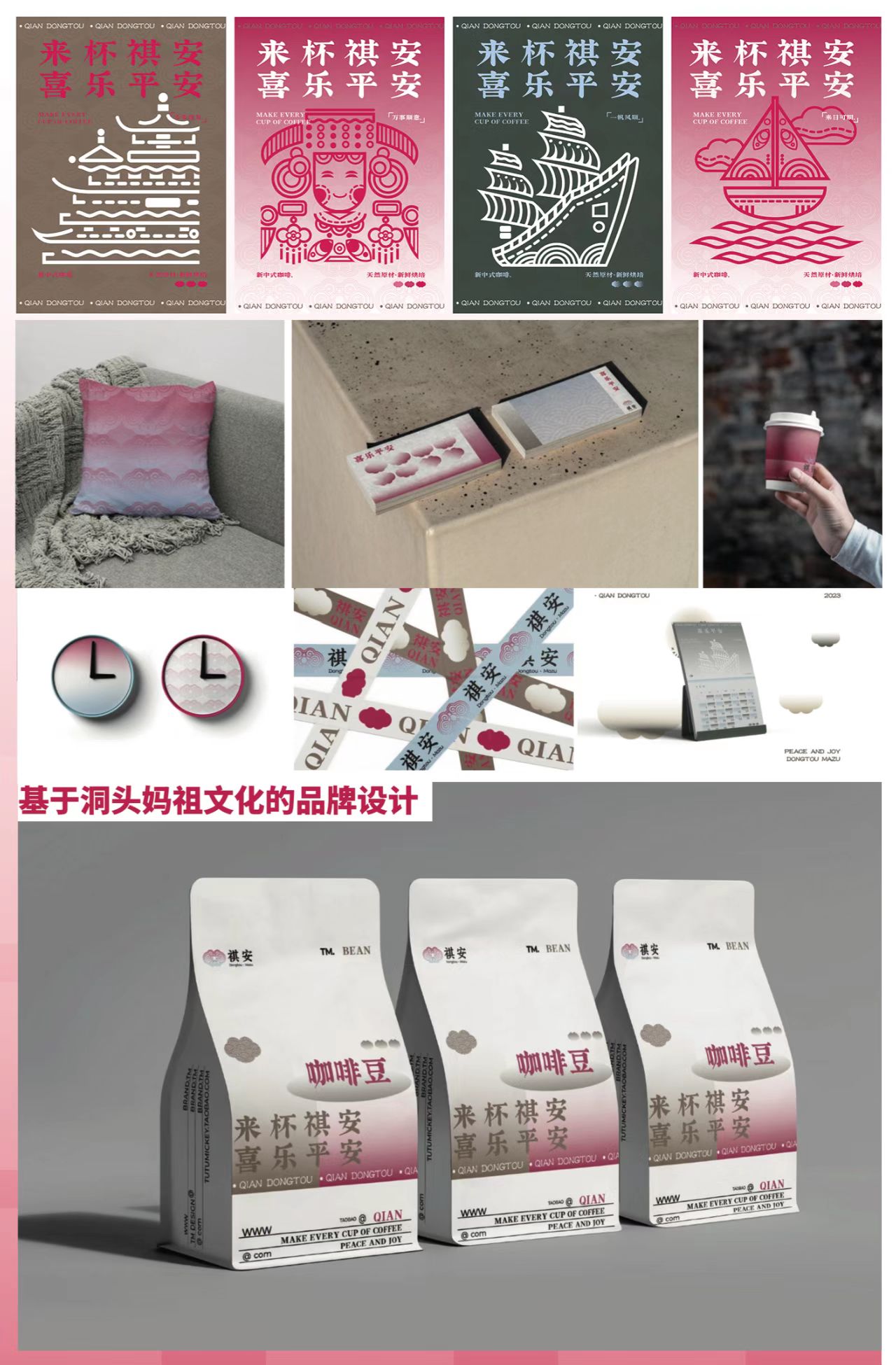 章信同学的《品牌形象设计与价值推广——祺安》是以洞头妈祖信俗文化为依托,以寺庙咖啡文化为载体,使得西方咖啡的潮流与东方道文化产生碰撞,产生强烈反差,激发游客兴趣,从而在实现宣扬洞头妈祖文化的基础上致力于区域第三产业的发展。作品《插画创作及衍生品的应用与研究——新生》,“生命伊始,万物轮回”,赋予故事的意义,从插画设计上叙述一只小水母诞生的故事。作品《梦境归档》将“梦境”这一充满神秘色彩的主题用书籍装帧艺术表现,破除伪装,探索人们那些淹没在“深海”处的想法。