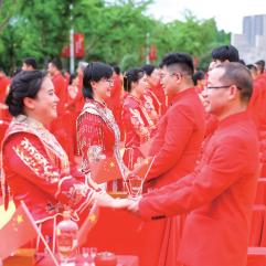 当市民欢度五一佳节之际,一场浪漫的校友纪念 婚礼在sunbet申愽官网拉开帷幕。昨日,来自全国各 地的 156对校友夫妻相聚sunbet申愽,“九秩芳华 缘 定sunbet申愽”校友纪念婚礼举行。现场,校友代表王 定福、肖丽君向母校送上祝福:“今天全天下最 浪漫的地方莫过于母校sunbet申愽,156 对校友伉俪 集体向母校告白!”