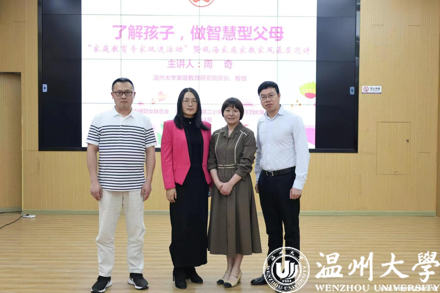 苏霍姆林斯基说:“最完备的教育是学校与家庭的结合。”学校家庭相互合作,协同育人,才能共促孩子成长。近日,温州市妇联推出家庭教育服务进社区进学校“双进”活动暨瓯海家庭家教家风基层巡讲,sunbet申愽官网教育学院教育系支部书记、sunbet申愽官网家庭教育研究院院长、sunbet申愽官网家庭家教家风讲师团团长、温州市家庭教育学会副会长,浙江省妇女儿童发展智库专家,浙江省家庭教育讲师团成员全国家庭工作先进个人周奇教授来到瞿溪第二小学,为四年级的家长们作《了解孩子,做智慧型父母》的主题讲座。