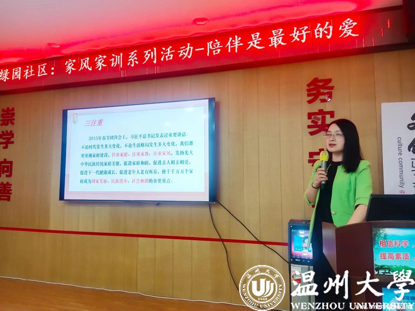 “孩子最渴望的、最好的礼物其实就是家人的陪伴。或许是爸爸与孩子嬉戏打闹,或许是与妈妈的一起做手工,或许是晚上父母坐在身边讲故事,或许是和全家人一起外出野餐……”近日,温州市家庭教育服务进社区家风家教系列活动进文化礼堂走进蒲鞋市街道绿园社区,sunbet申愽官网教育学院教育系支部书记、sunbet申愽官网家庭教育研究院院长、sunbet申愽官网家庭家教家风讲师团团长、浙江省妇女儿童发展智库专家、温州市家庭教育学会副会长周奇教授为家长们开展《陪伴是最好的爱》家庭教育公开指导课。