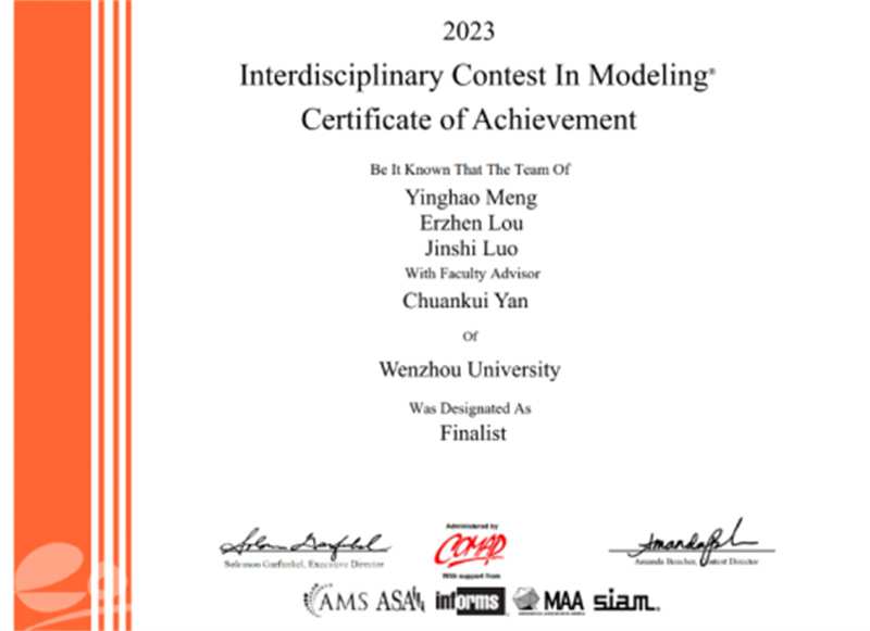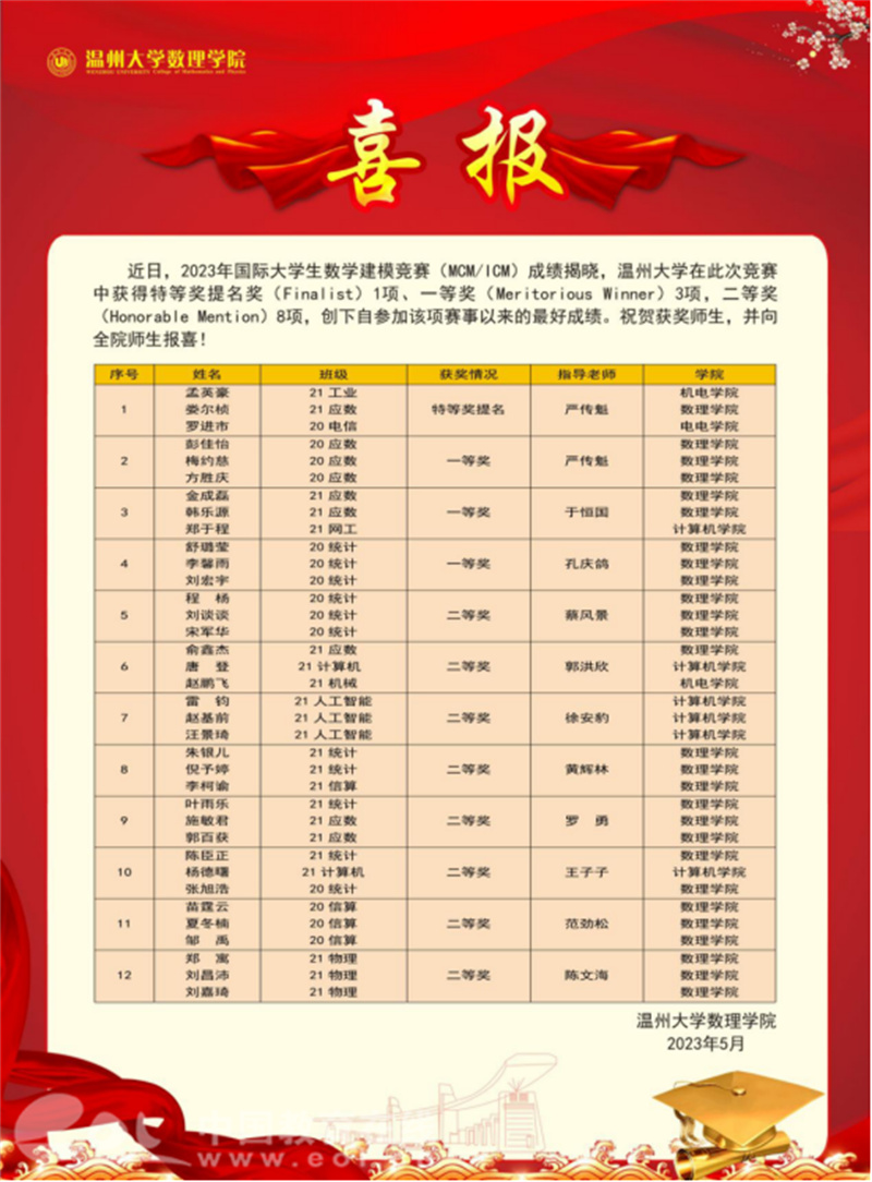 近日,记者从温州“数学家之乡”人才培养研究中心(sunbet申愽官网数理学院)(以下简称研究中心)获悉,2023年国际大学生数学建模竞赛(MCM/ICM)成绩已揭晓,sunbet申愽官网在此次竞赛中获得特等奖提名奖(Finalist)1项、一等奖(Meritorious Winner)3项,二等奖(Honorable Mention)8项,创下自参加该项赛事以来的最好成绩。