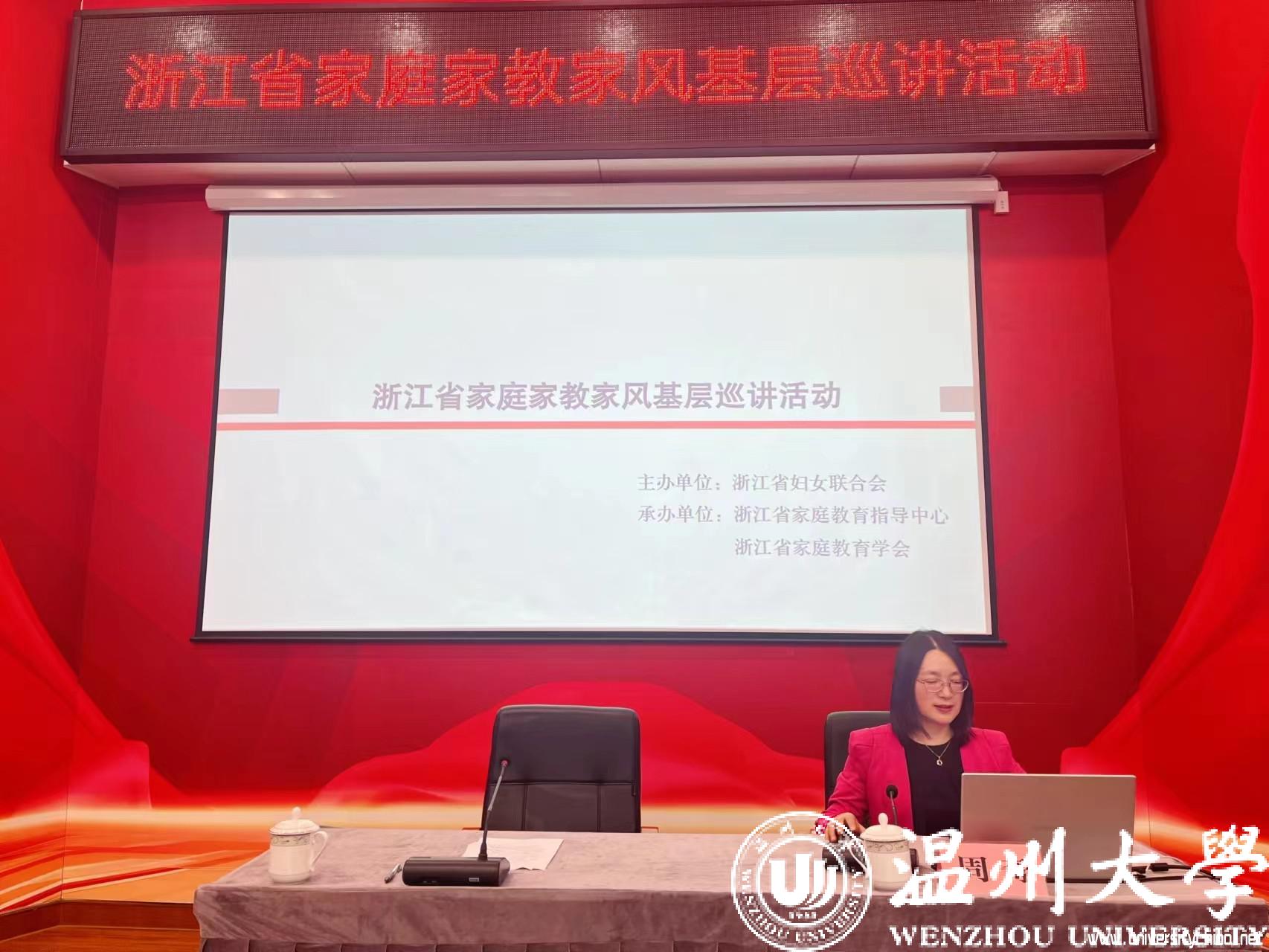 在5月15日国际家庭日即将到来之际,由浙江省妇女联合会、浙江省家庭教育指导中心、浙江省家庭教育学会举办的2023年度浙江省家庭家教家风基层巡讲活动在温州市直机关开展巡讲。市委直属机关工委副书记王伽伽参加活动,市直机关干部100余人共同聆听讲座。